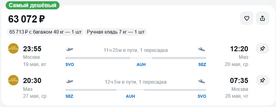 Перелет с одной пересадкой запланирован на период с 19 по 27 мая, а стоимость билета с включенным багажом составляет 65 700 ₽. Успейте забронировать свой райский отдых. 19 мая - 27 мая (8 ночей) https://trvl.click/x/e6PAc