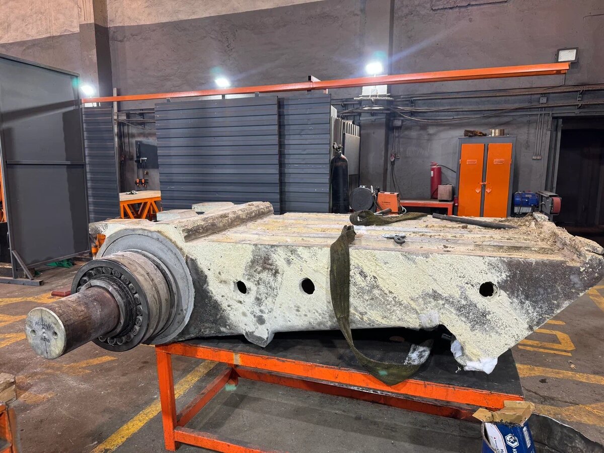 Щековая дробилка Terex 400 начала работать с шумом в узле подвижной щеки (питмана). Вес узла — 5,5 тонны, диаметр посадочных мест под подшипники — 400 мм. После разборки выявили комплекс дефектов, требующих вмешательства. Задача: устранить выработку, окислы и заломы При осмотре зафиксировали: Как ремонтировали Результат Посадочные места подвижной щеки восстановлены до номинального диаметра 400 мм, вал зачищен, дефекты крышки устранены, геометрия паза и упора приведена в норму. Узел собран и готов к установке в дробилку. Шум и вибрации ушли, оборудование снова работает штатно. Ваша щековая дробилка работает с шумом? Подписывайтесь на канал — показываем, как восстанавливаем посадочные места питмана и других узлов мобильной расточкой.
