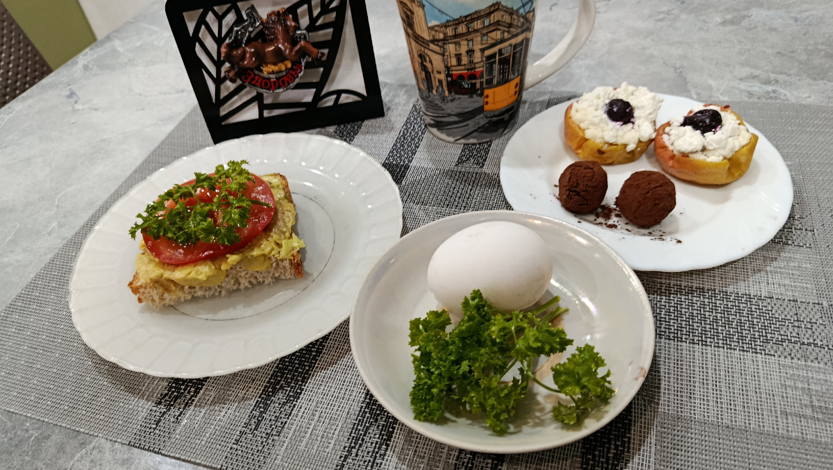 В общем , отварила яйцо в смятку (60 г) ,к яйцу добавила бутерброд (80 г) из серого хлеба с авакадо,помидоркой и зеленью петрушки ( уже своя). Также запекла яблоко в микроволновке ,начинила его 5% творогом,украсила ягодками чёрной смородины . А к чаю добавила 2 конфеты из отваренного нута,сухофруктов и дробленых грецких орехов . Конфеты обваляла в порошке какао. Вес яблок с конфетами - 140 г. А вес завтрака - 280 г.