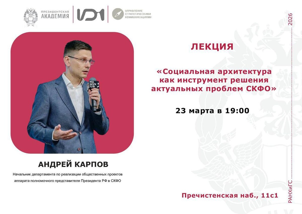 аппарата полномочного представителя Президента РФ в СКФО. Темой встречи станет «Социальная архитектура как инструмент решения актуальных проблем СКФО». В ходе мероприятия Вы узнаете об особенностях социальной архитектуры и на примере реальных кейсов вместе с экспертом разберете, как стать соавтором социально-политических решений, отвечающих современным задачам региона. 🙂Дата: 23 марта (понедельник) 🙂Время: 19:00 🙂Адрес: Пречистенская набережная 11с1 🙂Аудитория: лофт 012 Для того, чтобы стать участником втречи, необходимо заполнить заявку по ссылке до 12:00 23 марта: https://forms.yandex.ru/u/69b43d9495add53f2218da13 👻 MAX l 💬 Telegram l 💙 ВК