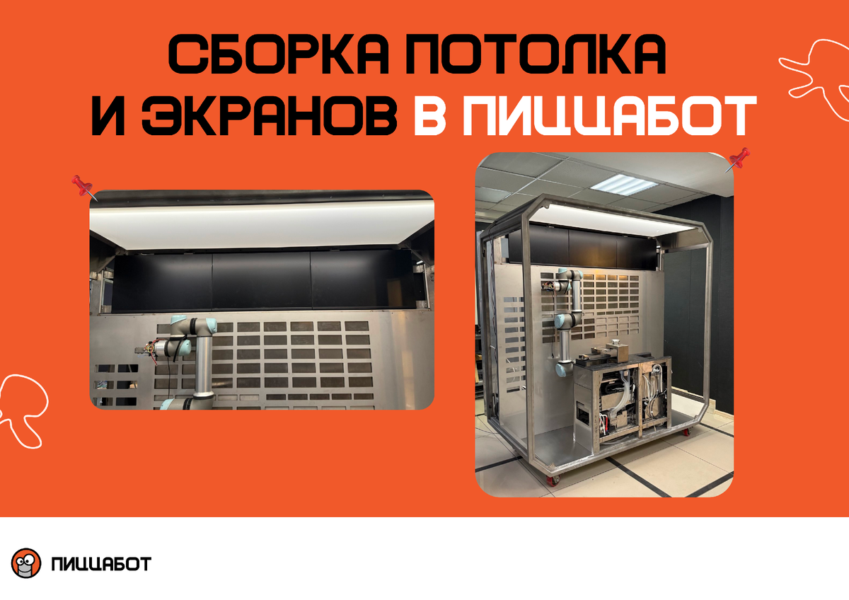 Потолок, свет и экраны выглядят как финальные штрихи. На практике это один из самых показательных этапов — здесь становится ясно, насколько система собрана «по-настоящему». На этом этапе мы занялись потолком, мониторами и первым вариантом освещения. Снаружи это кажется финальными штрихами, но на практике именно здесь появляется много нюансов, которые влияют на сборку и повторяемость. У ПиццаБот корпус со скошенными металлическими гранями. Такая форма помогает аккуратно распределять тёплый свет внутри и делает киоск визуально чище. Но есть нюанс: сложная геометрия сразу повышает требования к сборке. У деталей есть допуски, гнутые элементы могут немного отличаться, и всё это нужно состыковать так, чтобы корпус выглядел ровно и аккуратно. Задача на этом этапе была не просто собрать, а понять, как это будет собираться стабильно. Когда делаешь один экземпляр, можно подогнать руками. Когда думаешь про серию, нужно, чтобы всё сходилось без «доделок на месте». Именно здесь начинается переход о
