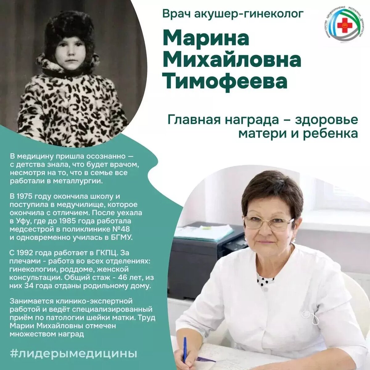 Её общий стаж в медицине — 46 лет. Министр здравоохранения РБ Айрат Рахматуллин рассказал о лидере медицины — акушер-гинекологе городского клинического перинатального центра Уфы Марине Тимофеевой. Марина Михайловна родилась в Белорецке. В медицину пришла осознанно — с детства знала, что будет врачом, несмотря на то, что в семье все работали в металлургии. В 1975 году после школы поступила в медицинское училище, которое окончила с отличием. После уехала в Уфу, где до 1985 года работала медсестрой в поликлинике № 48 и одновременно училась в БГМУ. Желание стать врачом было сильнее усталости — совмещать работу и учёбу было непросто, но оно того стоило. С 1992 года Марина Михайловна трудится в ГКПЦ. За ее плечами — работа во всех отделениях: гинекологии, роддоме, женской консультации. По её словам, раньше приходилось быть не только врачом, но и просветителем — читать лекции будущим мамам даже в ЗАГСе. «Сегодня женщины стали грамотнее, планируют беременность заранее, а она продолжает помогат
