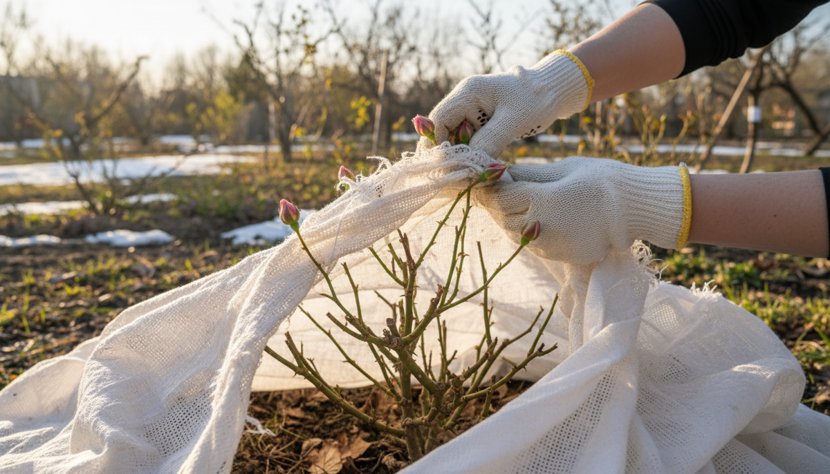 Под укрытием роза спит. По-настоящему спит — никакого движения соков, почки в глубоком покое. Это правильно, это защита.