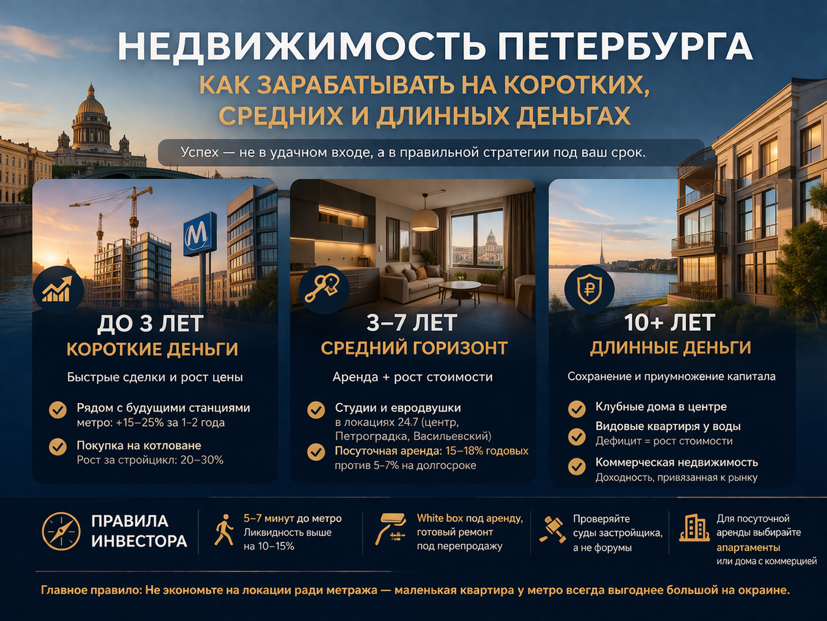 Главная ошибка начинающих инвесторов — искать «идеальную квартиру». На практике успех зависит не от удачного входа, а от того, насколько объект соответствует вашему горизонту инвестиций — короткому, среднему или длинному.
