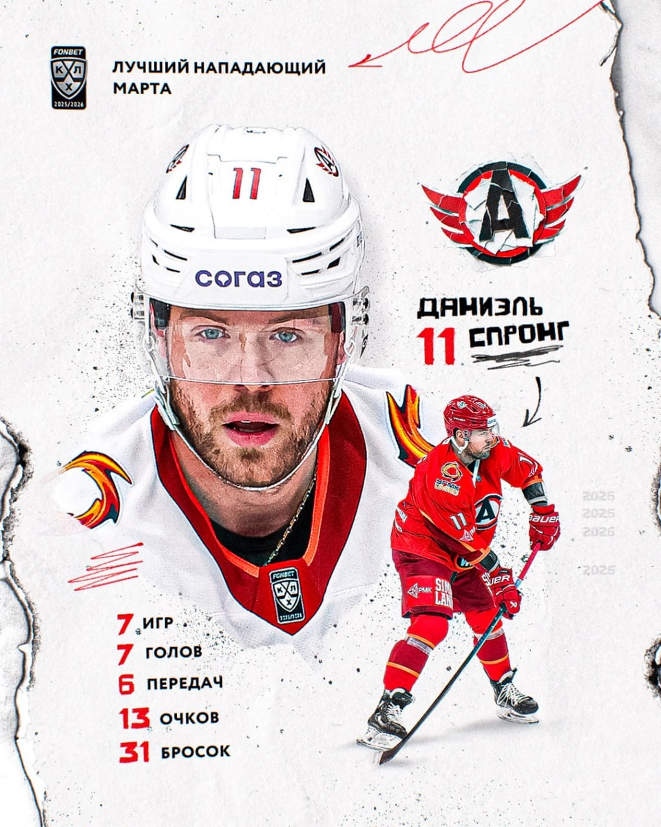7 голов и 13 очков в 7 матчах марта обеспечили Даниэлю Спронгу 🚗 первое в карьере звание лучшего нападающего месяца в КХЛ!