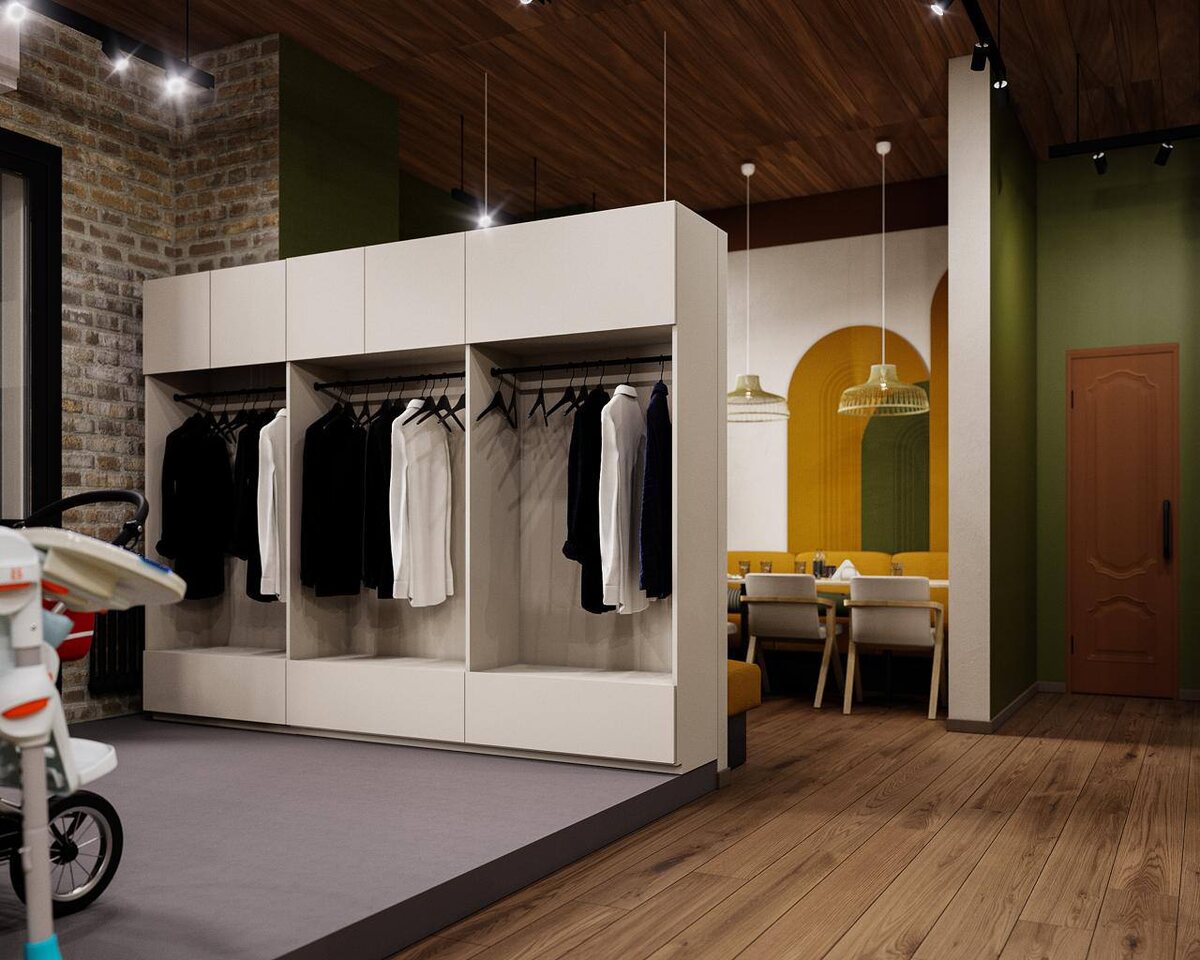 С самого входа чувствуется спокойствие. Ничего лишнего, всё аккуратно собрано, есть даже отдельная зона для колясок сразу понимаешь, что здесь подумали о людях. Фактурный камень, чистая подача, ничего не перегружает. Всё выглядит цельно и приятно глазу. Тёплое дерево, мягкие оттенки, живые растения и спокойный свет. Атмосфера такая, что не хочется спешить. Чуть глубже, чуть тише, больше уединения даже в общем пространстве. Подходит под любой сценарий: быстро выпить кофе или посидеть подольше. Есть и детская зона аккуратно встроена и не выбивается из общего стиля. Даже санузел здесь не просто «техническое помещение». Тёмная палитра, камень, мягкий свет и зелень всё в той же концепции. 🔝В итоге получилась кофейня, где реально комфортно. Про баланс, атмосферу и желание вернуться ещё раз. - Архитектор: Ирина Лебедева