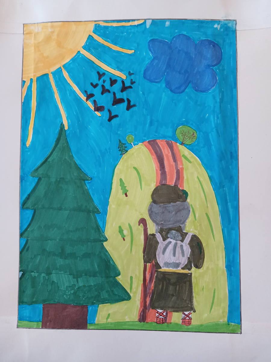 Описание: На создание этого рисунка меня вдохновило стихотворение Н. Рубцова «Старик», которое прочитала моя одноклассница Вера. Я хотела передать главную идею стихотворения - важность сохранения светлой души и смирения перед жизненными испытаниями. Старик символизирует мудрость и спокойствие перед жизненными испытаниями. А природа вокруг старика играет важную роль, отражая красоту окружающего мира и помогая старику преодолеть тяготы жизни.