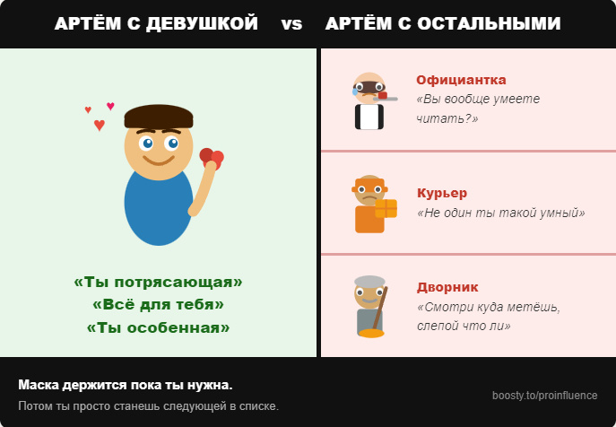 Знакомая рассказала историю. Я попросил разрешения поделиться - она согласилась. Говорит, пусть другие видят. Познакомилась с парнем. Назовём его Артём. Умный, внимательный, с юмором. Первые встречи — всё идеально. Слушает, интересуется, не торопит. Она думала - наконец нормальный человек. Но уже на второй неделе был один момент. Они сидели в кафе. Официантка перепутала заказ - принесла не тот соус. Мелочь. Артём не накричал, не устроил сцену. Просто сказал ей — холодно, с лёгким презрением — «Вы вообще умеете читать? Официантка извинилась и ушла. Артём тут же переключился обратно - улыбка, разговор, внимание. Знакомая почувствовала что-то неприятное. Но решила - ну бывает, устал, мелочь. Через две недели - курьер. Опоздал на двадцать минут. Артём открыл дверь и не поздоровался. Забрал пакет молча, потом бросил уже закрывая дверь — «в следующий раз хоть предупреждай, не один ты такой умный». Курьер ничего не ответил. Артём вернулся в комнату в хорошем настроении, как будто ничего не бы