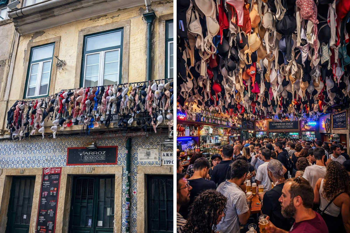 Arroz Doce — один из тех баров в лиссабонском Байрру-Алту, мимо которых невозможно пройти спокойно: фасад украшен сотнями лифчиков, развевающихся над улицей, словно праздничные флажки. Туристы сначала думают, что это арт‑инсталляция, но местные лишь улыбаются: традиция проста — оставляешь свой бюстгальтер, получаешь бесплатный шот. И всё это не городская легенда, а реальная практика, подтверждённая десятками восторженных (и слегка удивлённых) отзывов. Внутри бар напоминает музей импровизированной текстильной истории: разноцветные экспонаты свисают с потолка, создавая атмосферу лёгкого безумия, в которой живёт музыка — громкая, живая, искренняя. Arroz Doce давно стал местом, куда приходят не за изысканными коктейлями, а за настроением: здесь поют, шумят, спорят, знакомятся и теряют счёт времени. Название бара — «рисовый пудинг» — звучит почти невинно, но контраст между сладким образом и буйным характером заведения только добавляет шарма. Вечером улица Rua da Atalaia превращается в поток