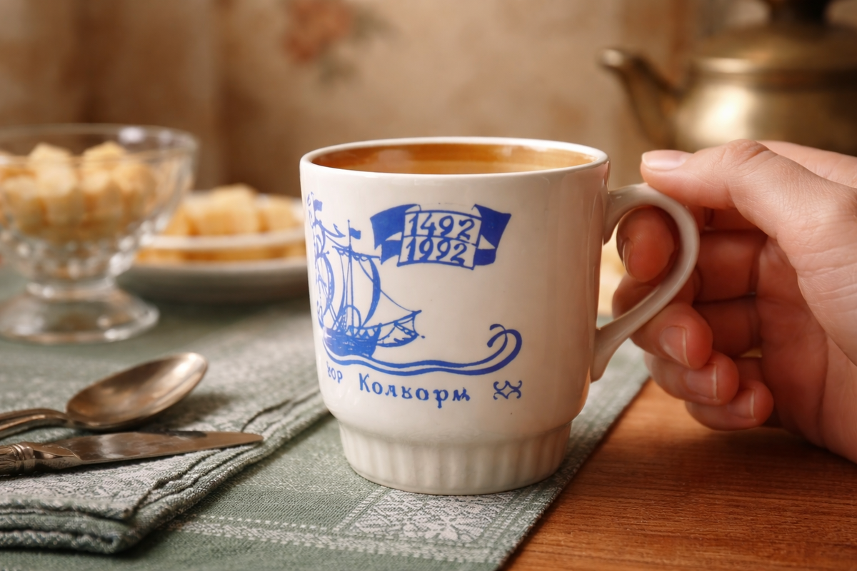 Форма — не случайная. Это классическая советская «устойчивая» форма: немного расширяющаяся кверху, с утолщённым низом, чтобы кружка держала тепло и не казалась хрупкой. Такие делали не для красоты. Такие делали — на каждый день, но на годы. И именно поэтому они пережили всё. 🍵🍵🍵 А потом ты замечаешь рисунок. Кобальт. Глубокий, насыщенный синий, который невозможно перепутать ни с чем другим.