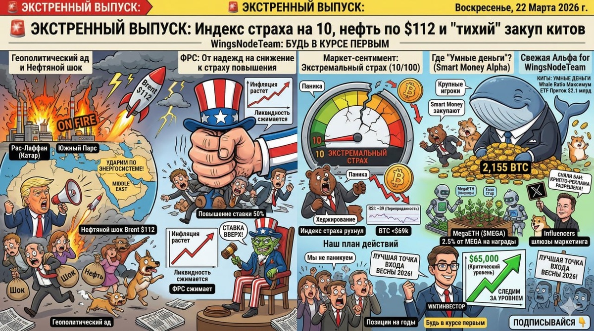 Друзья, воскресенье 22 марта выдалось максимально напряженным. За последние 3 дня ландшафт изменился сильнее, чем за весь прошлый месяц. Если вы пропустили наш обзор от 19-го числа - обязательно перечитайте, а теперь даем апдейт по текущему "шторму". 🔥 Геополитический ад и Нефтяной шок Эскалация достигла критической точки: Иран нанес удар по газовому заводу Рас-Лаффан в Катаре (ущерб на миллиарды долларов), а Израиль ответил ударами по месторождению Южный Парс. Цена на нефть марки Brent пробила отметку $112. Трамп уже пригрозил Ирану ударами по энергосистеме, что мгновенно ввергло рынки в состояние шока. 🤔 ФРС: От надежд на снижение к страху повышения Из-за взлета цен на энергоносители логика ФРС изменилась. Трейдеры теперь закладывают 50% вероятность повышения ставки до октября (забудьте про снижение в июне). Это "двойной удар" по рисковым активам: инфляция растет, а ликвидность сжимается. 📈 Маркет-сентимент: Экстремальный страх (10/100) Индекс страха и жадности рухнул до 10 пун