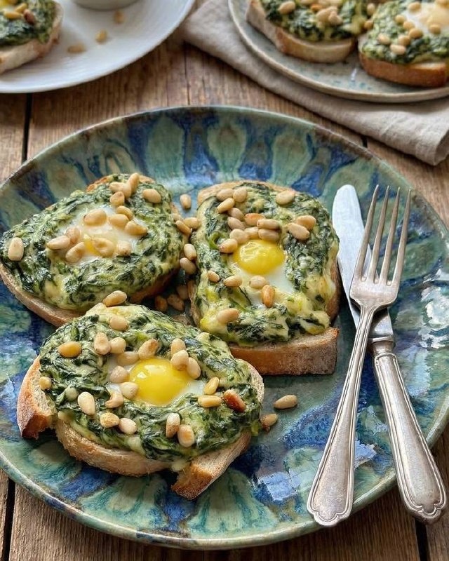 Готовится проще, чем может показаться на первый взгляд. Нам очень зашли👌 Уже не раз готовила. Ингредиенты: 🥚 Шпинат — 100 г 🥚 Творожный сыр — 4 ч.л. 🥚 Перепелиные яйца — 4 шт 🥚 Бездрожжевой хлеб — 2 ломтика 🥚 Кедровые орешки — 5 г 🥚 Оливковое масло — 1 ч.л. 🥚 Зелень, соль, перец — по вкусу Как готовить: 1. На сухой сковородке обжарьте кедровые орешки. 2. Обжарьте шпинат 5 минут на сковороде с маслом. 3. Смешайте шпинат с творожным сыром, посолите. поперчите. 4. Намажьте на ломтики хлеба. 5. Сделайте углубления и вбейте по 2 яйца в каждый тост. Если кусочки хлеба маленькие, то по одному яйцу. 6. Запекайте в духовке при 180°C 10–15 минут. 7. Готовые тосты посыпьте орешками и зеленью. Это, конечно, завтрак не на каждый день, но иногда можно для разнообразия😀👌 #завтрак #яйца