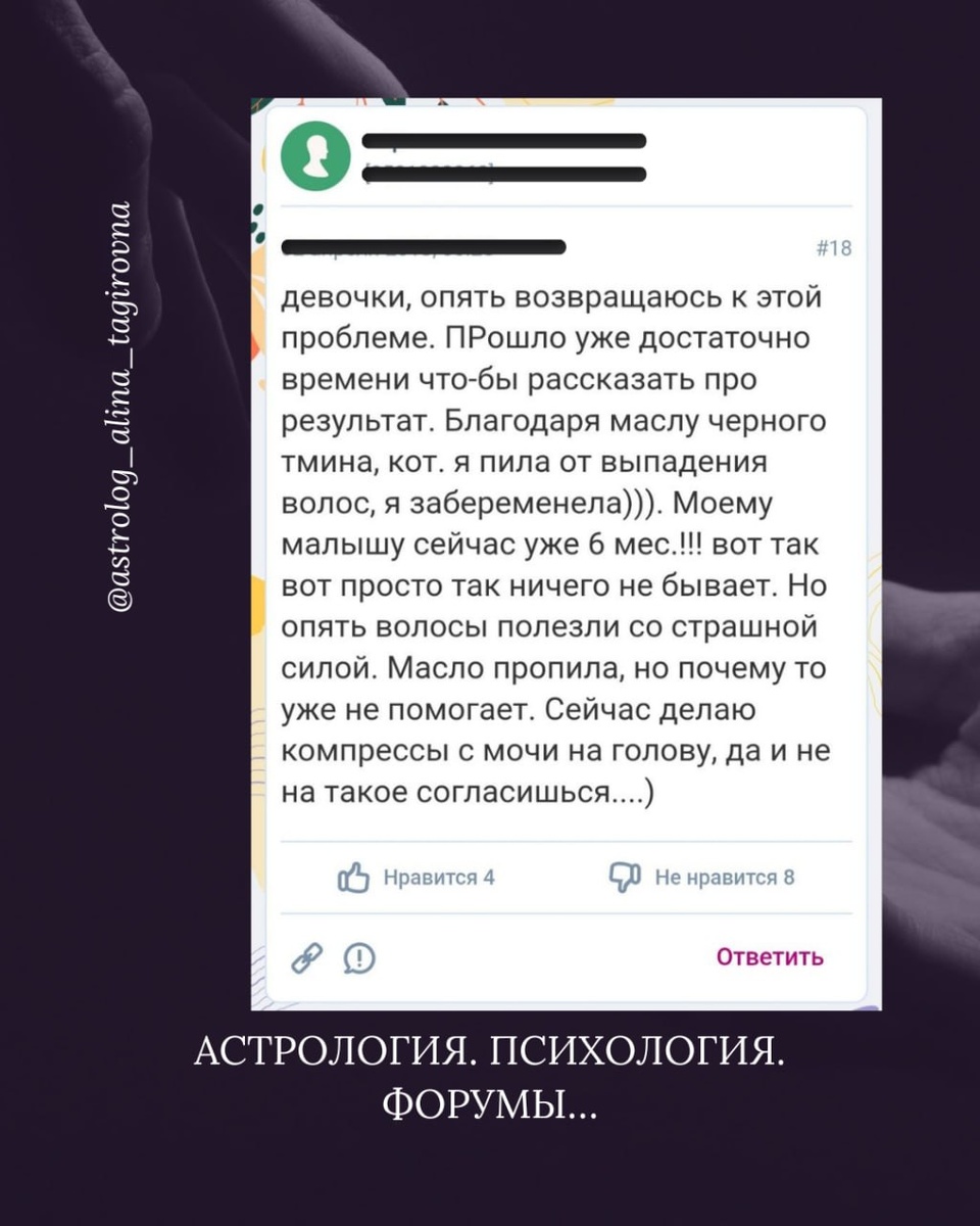 Кто-то — за советом. Кто-то — «просто почитать». Кто-то — убедиться, что у него всё не так уж и плохо. И я — не исключение. Более того, в силу своей профессии мне безумно интересны такие площадки. Это живой срез: мышления, страхов, надежд, иллюзий. Там — настоящая психология. Там — настоящая жизнь. И вот недавно натыкаюсь на сообщение. Девушка пишет, что благодаря маслу чёрного тмина, которое она пила от выпадения волос, она забеременела, родила и сейчас её малышу уже 6 месяцев. Вот только волосы стали выпадать ещё хуже, масло уже не помогает почему-то, и она делает компрессы с мочи на голову. Если честно — я очень долго смеялась☺️. Потом подумала: «Форум, как всегда, не подвёл, настроение сделал». Потом я подумала, что срочно нужно делать женскую консультацию или марафон, или может даже интенсив… А потом… А потом стало не смешно. Потому что за этим — стоит реальность. Люди массово бегут на форумы и ищут ответы у таких же людей, которые сами эти ответы ищут. Один попробовал — «