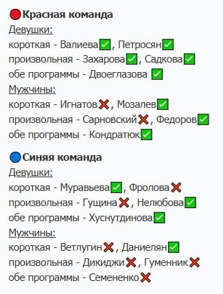 Но, судя по всему, там не столько какой-то тактикой руководствуются, сколько простым желанием фигуристов напрягаться и катать ПП.🤷 Хотя в команде Москвы угадала почти все. Всего 1 ошибка - Сарновский вместо Игнатова катал КП. Так себе решение. Если Макар сдюжил, то Никита занял последнее место. А вот в команде Санкт-Петербурга ошибок куда больше, особенно у парней. Ну в принципе изначально писала, что там самая большая неопределенность. После снятия Угожаева до последнего думала, кого поставить на обе программы - Гуменника или Семененко. Выбрала Семененко и промахнулась. У девушек Фролова откатала ПП, а Гущина КП. Кто знает, может, если бы они пошли по моему варианту, то набрали бы куда больше баллов.😉 По итогу очень рада за Машу Захарову.👏 Ей нужен был этот чистый прокат ПП (и в частности, чистый 4Т) после провала на ФГПР, чтобы завершить сезон на высокой ноте.