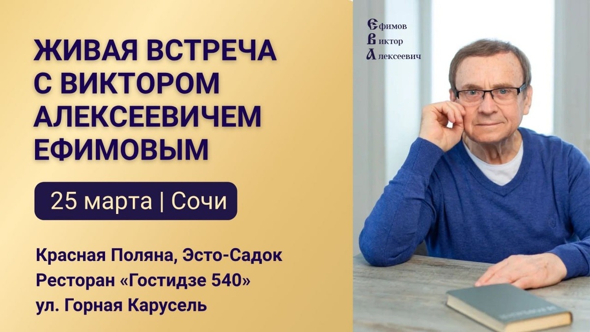 🌿 25 марта состоится живая встреча с Виктором Алексеевичем Ефимовым в Сочи. Тема лекции: ЦИВИЛИЗАЦИОННЫЙ КОЛЛАПС. СУТЬ СЦЕНАРИЕВ ГЛОБАЛЬНОГО ПЛАНИРОВЩИКА И «НАШ ОТВЕТ ЧЕМБЕРЛЕНУ» 📍 Красная Поляна, Эсто-Садок Ресторан «Гостидзе 540» ул. Горная Карусель 🕚 11:00 — сбор участников 🕛 12:00 — начало лекции Для встречи будет подготовлен отдельный зал — в тёплой, спокойной атмосфере для живого общения и глубокого разговора. Участие в лекции — бесплатное. Еду и напитки каждый заказывает по желанию. Это хорошая возможность услышать Виктора вживую,задать вопросы и провести время в кругу единомышленников. Будем рады встрече. Быть добру!🌿