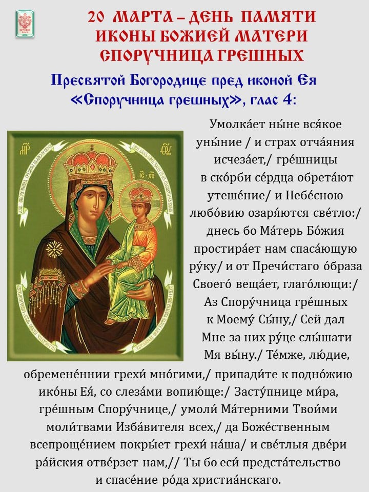 ". Впервые этот образ прославился чудесами в Николаевском Одрине мужском монастыре Орловской губернии в середине 19-го века. Древняя икона из-за ветхости своей не пользовалась должным почитанием и стояла в старой часовне у монастырских ворот. В 1843 г. многим жителям в сновидениях было открыто, что икона эта наделена, по Божьему Промыслу, чудотворной силой. Икону торжественно перенесли в церковь. Первым получил исцеление расслабленный мальчик, мать которого горячо молилась перед этой святыней. В 1848 году усердием москвича Димитрия Бонческула был сделан список с этого чудотворного образа и помещен в его доме. Вскоре он прославился истечением целительного мира, давшего многим выздоровление от тяжких болезней. Этот чудотворный список перенесли в храм святителя Николая в Хамовниках, в котором был устроен тогда же придел в честь иконы Божией Матери "Споручница грешных".