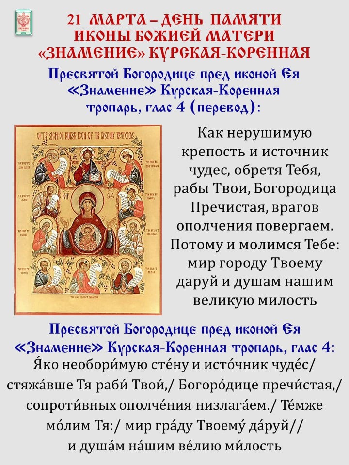 Охотник из Рыльска нашел ее в лесу на корнях дерева, он поднял икону, и забил источник чистой воды. Охотник со спутниками сейчас же срубили небольшую часовенку, в ней и поставили икону. Жители Рыльска стали посещать ее для поклонения, и от иконы стали источаться многочисленные чудотворения. Икону попытались перенести в Рыльск, но она трижды возвращалась в часовенку. В 1385 г. татары разрубили икону, живший при часовне священник с молитвой нашел обе половинки, сложил их вместе, и они чудесным образом соединились, не оставив следов разрушения и только на едва заметном месте раскола выступило нечто, похожее на росу. У этой иконы молился и получил свое первое исцеление прп. Серафим Саровский. С 1920 по 1944 гг икона пребывала в Сербии, с 1957 г пребывает в Нью-Йорке и является главной святыней Русской Зарубежной Церкви. В мужском монастыре Коренная пустынь находится чудотворный список. В 2009 г икона посещала Россию для поклонения верующих