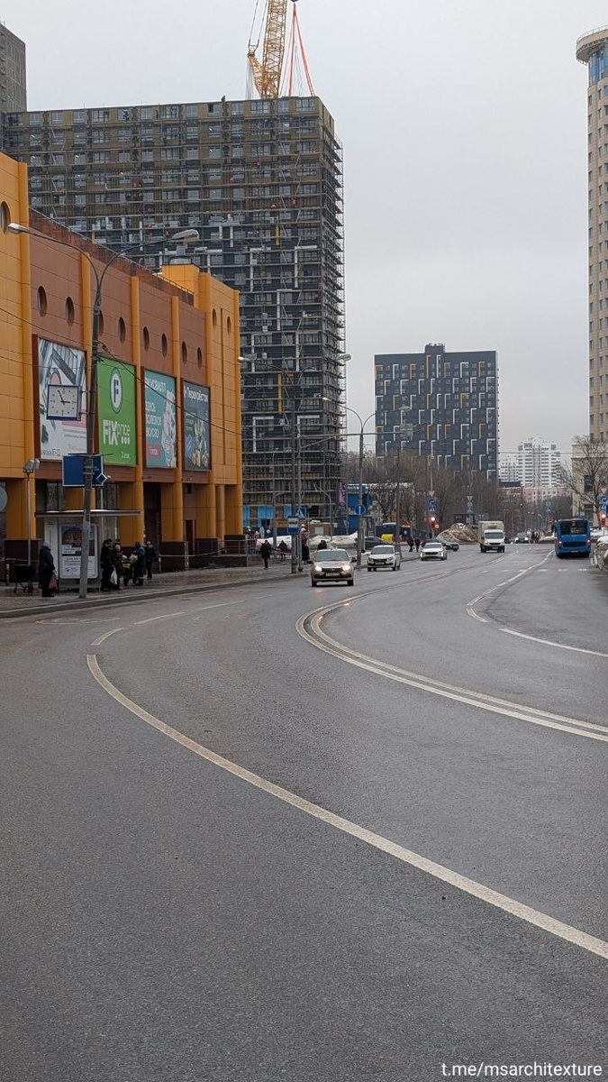 Радикально меняется образ района вокруг метро Новые Черёмушки в контексте стройки реновационный домов. Грустновато, потому что вылетная магистраль, как называют главные улицы в мэрии, явно заслуживает лучшего по своей красной линии. А получили мы монструозные стенки да ещё и с фиговыми фасадами. На их фоне дом 32, который мы смотрели ранее, даже потерялся. Строят очень быстро, дом собиграют блоками, прямо краном загружая очередной "кубик". 📱 Архитекстура #Москва #реновация