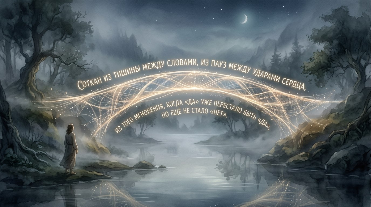 В той стране, где реки текут вспять, а тени падают не в ту сторону, где деревья растут корнями вверх, а звёзды прячутся днём и выходят ночью греться к луне, стоял мост. Он не был ни каменным, ни деревянным. Он был соткан из тишины между словами, из пауз между ударами сердца, из того мгновения, когда «да» уже перестало быть «да», но ещё не стало «нет». Появлялся он только тогда, когда на берегу сходились двое: один, чьи глаза горели уверенностью, как фонари в тёмном переулке, и другой, чьи пальцы дрожали, словно осенние листья на ветру. Они стояли друг напротив друга, разделённые рекой, вода в которой была одновременно и мутной, и прозрачной, и глубокой, и мелкой. И тогда воздух начинал вибрировать - нежно, как струны забытой арфы. Между «есть» и «нет» протягивались тонкие нити - невидимые, но крепче стали. Они сплетались в узор, похожий на морозные цветы на стекле: красивые, хрупкие, но способные пережить самую лютую зиму. Мост рос сам собой. Его перила были из невысказанных слов, сту