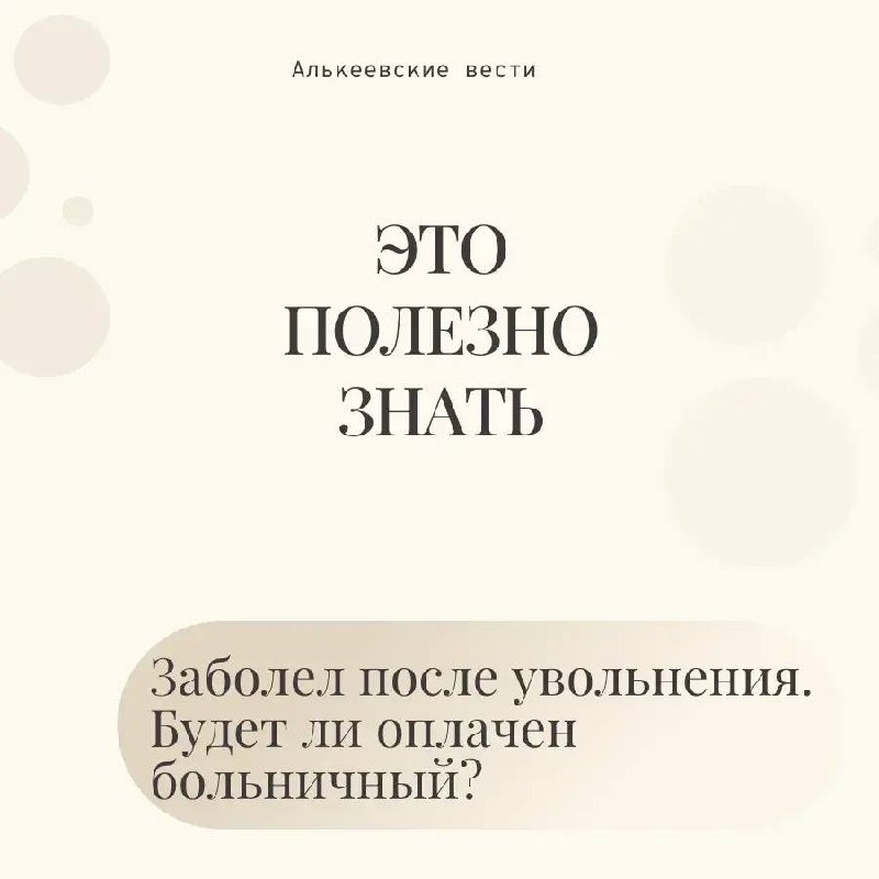 Будет ли оплачен больничный? ✅ Да, будет. Право на оплату больничного сохраняется, если вы уволились и еще не устроились на новую работу, а заболевание или травма наступили у вас в течение 30 календарных дней после увольнения. | 📰Новости Алькеевского района📸 MAX-канал - подпишитесь. Вконтакте - подпишитесь. Сайт - посмотреть.