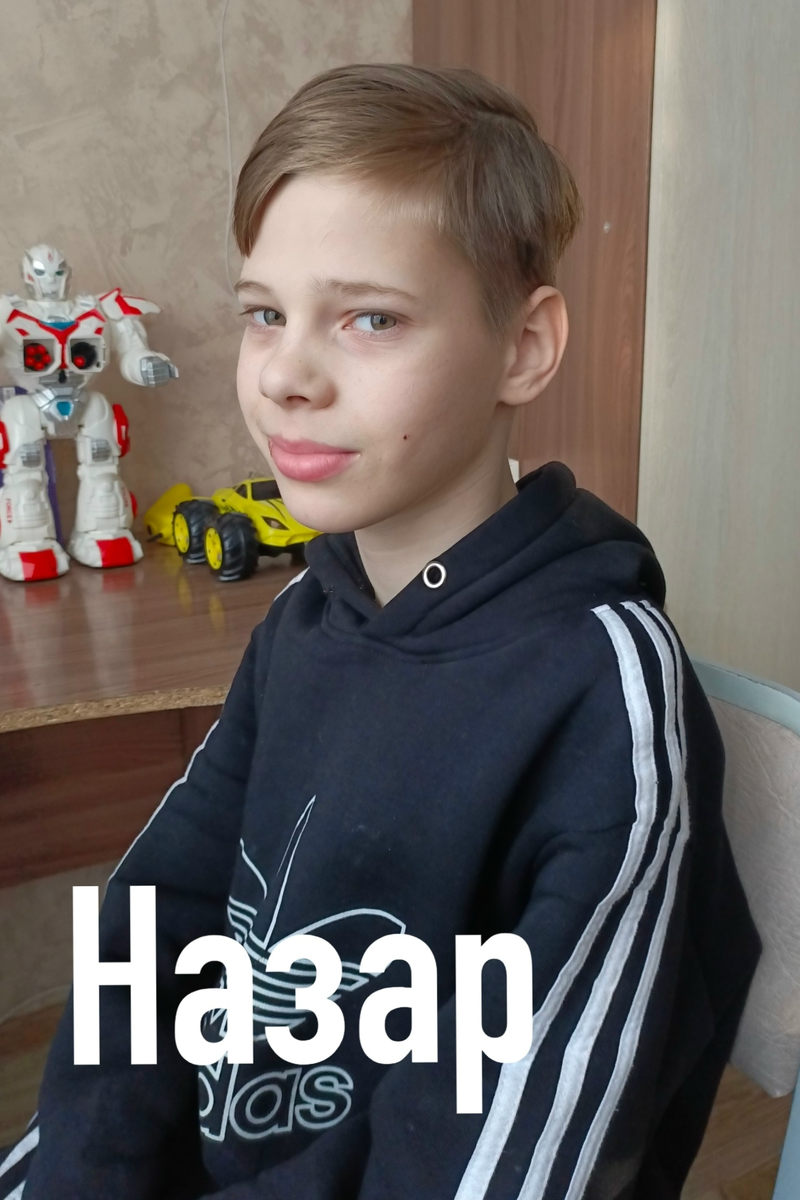 Пожалуйста, не оставайтесь в стороне - СДЕЛАЙТЕ ПЕРЕПОСТ! Дети невероятно меняются, когда в их жизни появляются родители, которые их любят! Назар открытый, добрый, общительный и жизнерадостный мальчик. В коллективе сверстников общается на равном уровне, лидерских качеств не проявляет, но на все имеет свою точку зрения. В общении со сверстниками дружелюбен, неконфликтен, со взрослыми доброжелателен, вежлив. На замечания реагирует адекватно, старается их выполнять. Самостоятельно выполняет все трудовые поручения. Обучается в средней общеобразовательной школе. С программным материалам справляется удовлетворительно, пропусков уроков не допускает. Не всегда может самостоятельно выполнить задания, нуждается в помощи взрослых. В свободное от занятий время, активно участвует в спортивных и творческих мероприятиях детского дома. Назар поет, рисует, а так же любит готовить. У Назара 5-ая группа здоровья. Но, несмотря на физические ограничения в состоянии здоровья, мальчик играет в футбол и катае