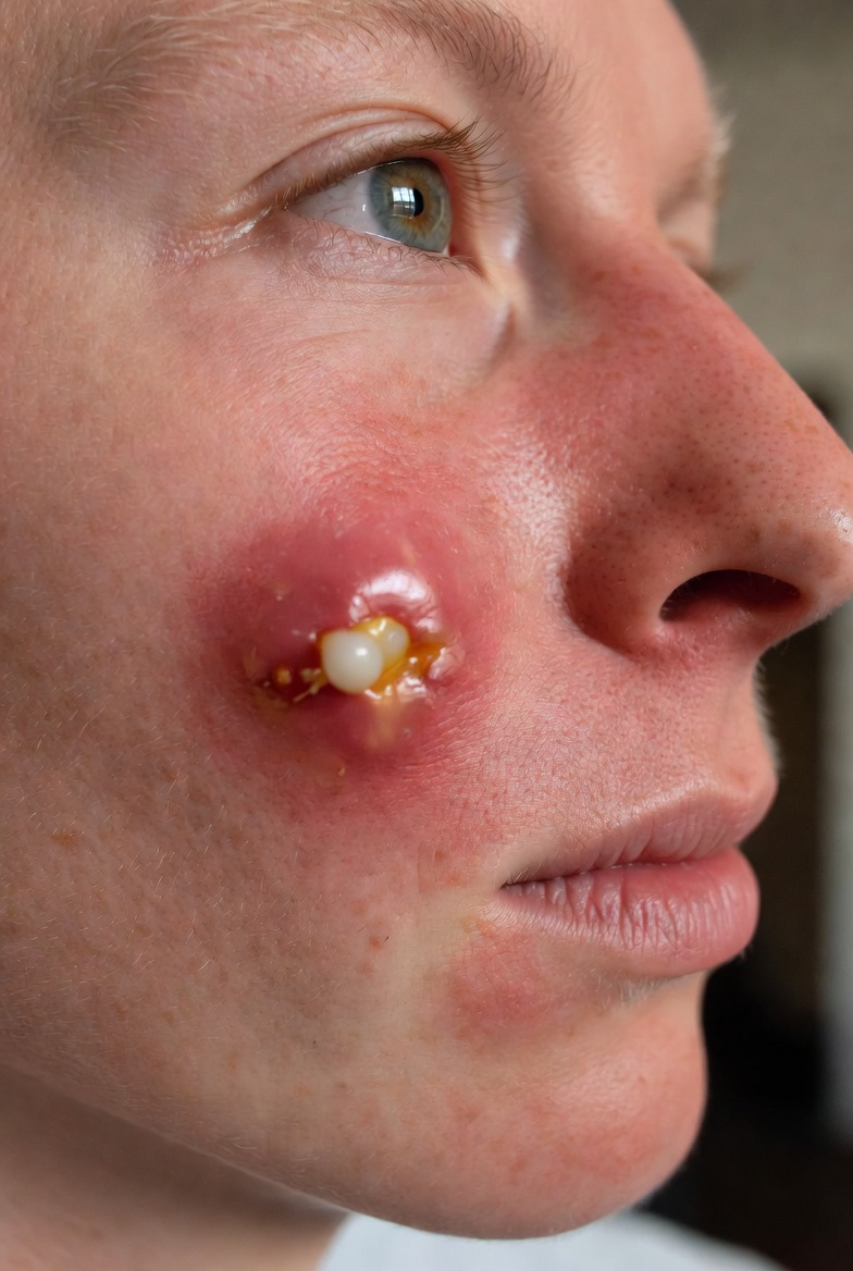 · Фурункул расположен на лице, в носу, в ухе или на шее.
