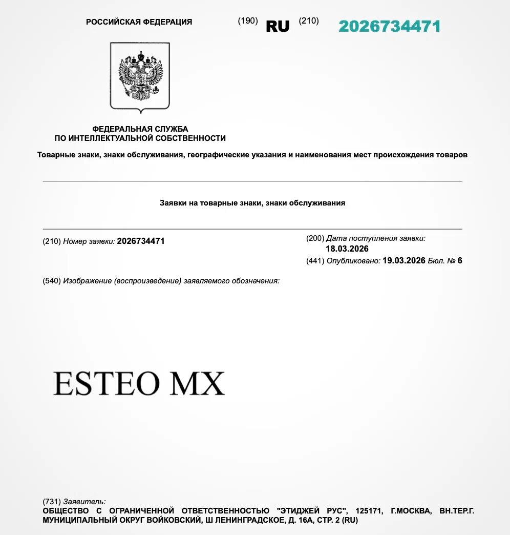 Компания «Этиджей Рус» подала заявки на регистрацию товарных знаков Esteo RX и MX База Роспатента пополнилась заявками на регистрацию товарных знаков Esteo RX и Esteo MX. Их подала компания «Этиджей Рус», выяснил «Журнал Авто.ру». Предполагается, что под этим брендом на российский рынок выйдут кроссоверы Exeed отечественной сборки. Источник: ФИПС Кроме того, в Роспатент поступила заявка на регистрацию наименования компании на кириллице, что соответствует требованиям нового закона о русском языке. Документ был подан 18 марта и опубликован на следующий день. После прохождения регистрации «Этиджей Рус» получит права на товарный знак сроком на 10 лет.
