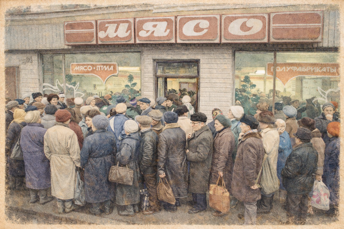 Если спросить любого советского человека о главном символе той эпохи — многие назовут не космос и не БАМ. А очередь. Длинную, медленную, молчаливую. За колбасой, за маслом, за сахаром. Иногда просто "за чем дают". Это была не случайность и не временная проблема. Очередь была встроена в советскую систему как обязательный элемент. Советская экономика работала по плану. Государство решало сколько чего производить, по какой цене продавать и куда везти. Цены были искусственно низкими — и это звучит хорошо, пока не понимаешь обратную сторону. Низкая цена при недостаточном производстве — это и есть дефицит. Колбаса стоила дёшево, все хотели колбасу, колбасы не хватало. Решение было простым и жестоким одновременно: кто первый встал — того и тапки. Точнее, того и колбаса. Очередь в СССР была целым социальным институтом со своими правилами. Сначала нужно было "занять". Пришёл, спросил "кто последний", запомнил человека. Можно было уйти на полчаса — но потом вернуться и найти своё место. Это негл