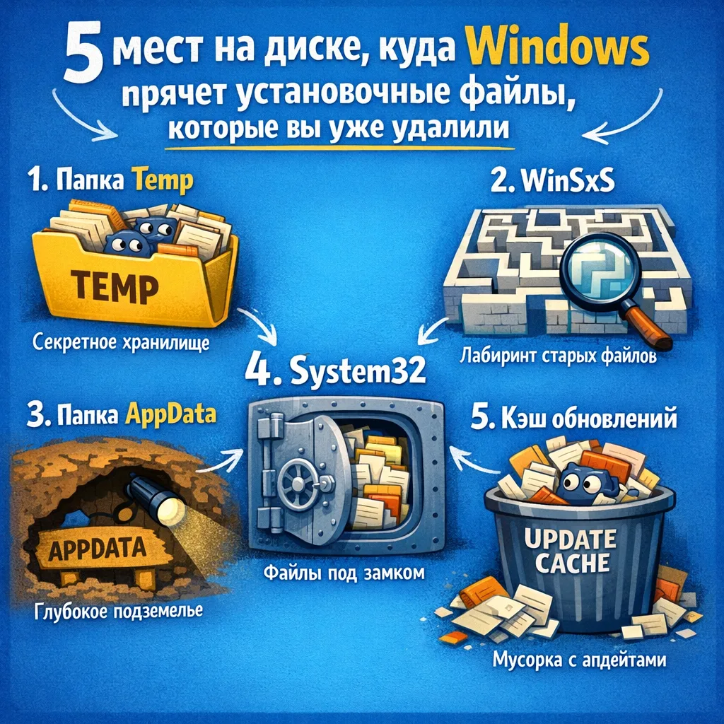 А занял их сам Windows, который упорно хранит установочные файлы, резервные копии обновлений и прочие "страховочные" копии на случай, если вы захотите откатить изменения. Программа удалена, а её установщик, распакованный в недрах системы, продолжает пылиться годами. В этом материале — пять главных мест, где Windows прячет то, что вы давно не используете, и инструкция, как вернуть себе гигабайты без риска для системы.