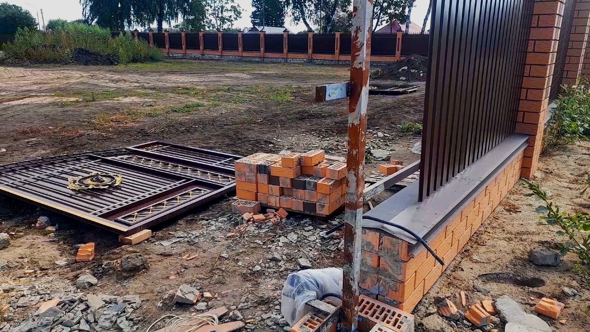 С виду обычный забор, но давайте присмотримся. Крайние столбы, на которые ворота крепились, пришлось полностью разобрать. Сейчас расскажу почему, чтобы вы не наступили на те же грабли. Когда строили этот забор, под него залили фундамент, а в качестве сердечников для столбов использовали профильную трубу 40×40 мм. Сверху всё обложили кирпичом, приварили прожилины, повесили ворота. Ворота кованые, тяжёлые, навесные. И вот тут кроется главная ошибка.