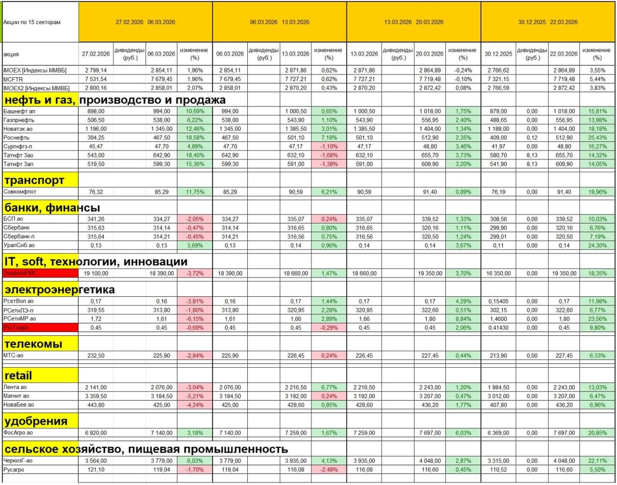 Сильные тренды Портфели Индекс полной доходности Мосбиржи (включая дивиденды) вырос с 30 12 2025г на 5% Портфели на фондовой секции ФОРТС выросли на 7% (без учёта срочного рынка) Анализирую фундаментал и тренды 87 компаний RU Выкладываю единую таблицу EXCEL (и фундаментал, и портфели). В этом посте — только анализ трендов. Зелёным фоном выделил акции, которые, с учётом дивидендов, растут больше, чем индекс полной доходности Мосбиржи, красным, которые меньше. Красным фоном выделил названия акций, у которых опасный фундаментал (долг выше 3 EBITDA или отрицательный свободный денежный поток FCF или отрицательная чистая прибыль). Оранжевым фоном выделил акции, по которым IPO было после начала СВО. Скрыл строки, которые хуже индекса Обычно, выбираю акции с сильными трендом и фундаменталом.