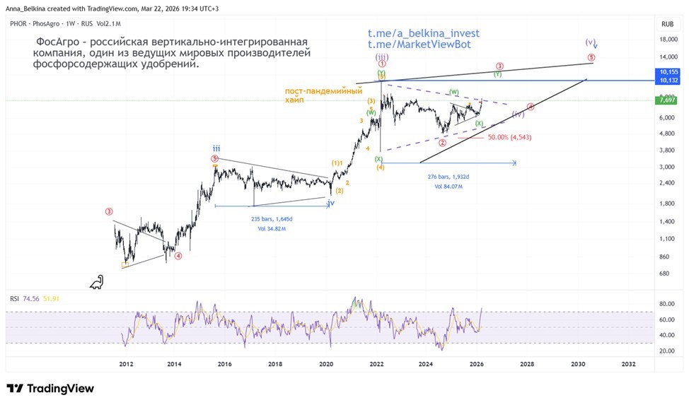 #AKRN #PHOR ФосАгро и Акрон Если смотреть на фундаментал, обе компании остаются интересными в текущих реалиях рынка. ✅ Логика простая. Это экспортно-ориентированный сектор с привязкой к мировым ценам на удобрения и валютной выручке. На фоне текущего (хотя с моей точки зрения, локального) ослабления рубля такие компании получают дополнительную поддержку за счёт переоценки экспортной выручки. При этом спрос на удобрения остаётся устойчивым. Это базовый сектор, напрямую связанный с продовольственной безопасностью. ФосАгро #PHOR Выглядит более предсказуемо с точки зрения бизнеса. У компании сильная сырьевая база, вертикальная интеграция и стабильные экспортные потоки. Это делает её более понятной историей для рынка, к тому же бумага обладает более высокой ликвидностью. Акрон #AKRN Более узкая и волатильная история. За счёт структуры бизнеса и меньшей ликвидности движения здесь могут быть резче, особенно при заходе капитала. ‼️По технике. 1⃣По #PHOR рассматриваю два сценария. 🔹