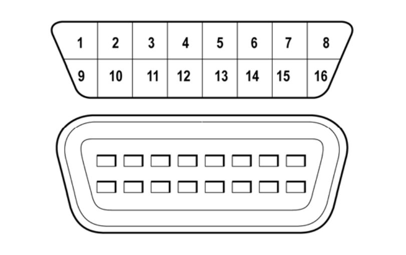 Стандартное распределение штырьковых соединений 16-контактного разъема DLC (Вид со стороны проводов)