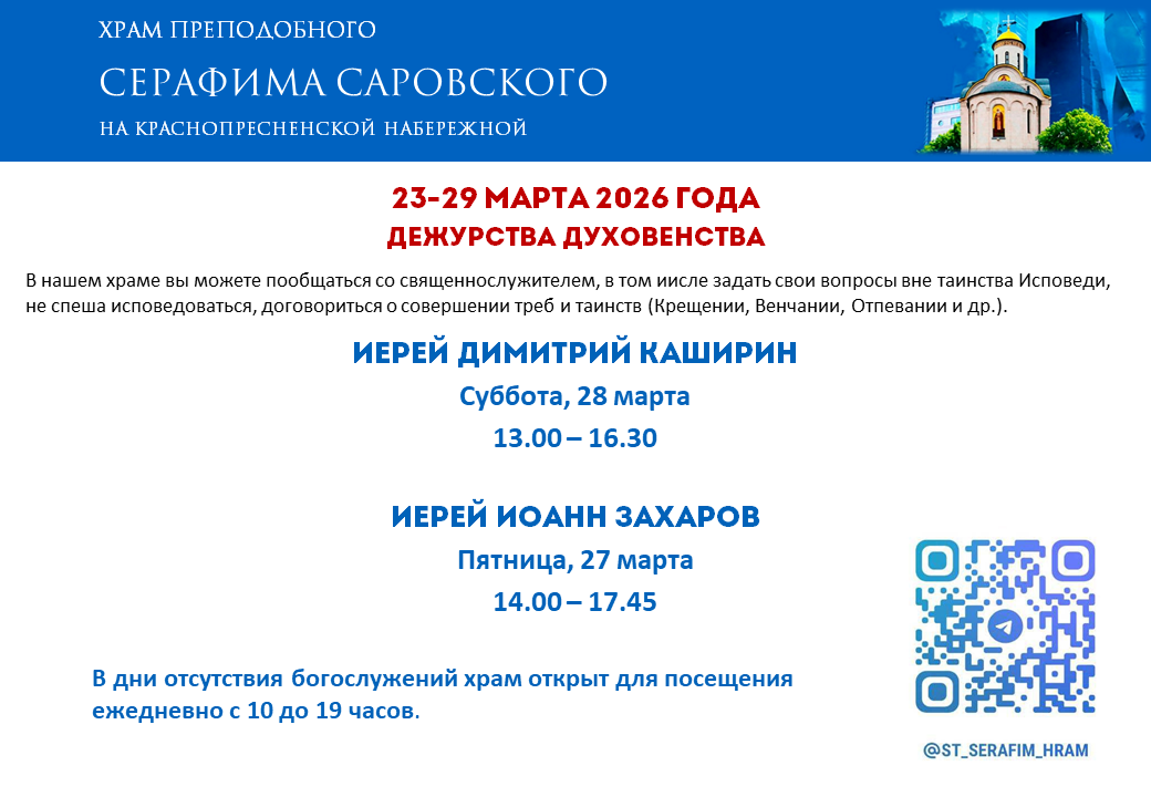 Мч. Агапия и с ним семи мучеников: Пуплия, Тимолая, Ромила, двух Александров и двух Дионисиев. Сщмч. Александра, иерея в Сиде. Мч. Никандра. Сщмчч. Алексия пресвитера. Сщмч. Михаила пресвитера 🕖7.00 Часы. Изобразительны. Вечерня. Литургия Преждеосвященных Даров 🕕18.00 Утреня, 1 час Похвала Пресвятой Богородицы (Суббота Акафиста) 🕣8.30 Часы. Литургия 🕔17.00 Всенощное бдение Неделя 5-я Великого поста. Прп. Марии Египетской. Мч. Савина. Мч. Папы. Ап. Аристовула, еп. Вританийского (Британского). Сщмч. Александра, папы Римского. Мч. Иулиана Аназарвского. Свт. Серапиона, архиеп. Новгородского. Сщмчч. Трофима и Фала, пресвитеров Лаодикийских 🕗8.00 Исповедь 🕣8.30 Часы. Литургия свт. Василия Великого. Требы Пассия 🕔17.00 Вечерня. Акафист Страстям Христовым Суббота, 28 марта 🕐13.00 – 16.30 Пятница, 27 марта 🕑14.00 – 17.45