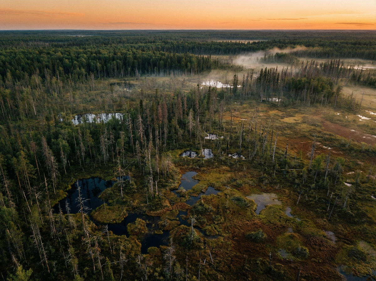 Первое, что выбивает из колеи — масштаб. Васюганские болота раскинулись на территории больше 53 тысяч квадратных километров. Для сравнения: это больше, чем вся Швейцария или Дания. Причём это не разрозненные топи, а единый живой организм, который дышит, растёт и продолжает расширяться прямо сейчас, пока вы читаете эти строки.