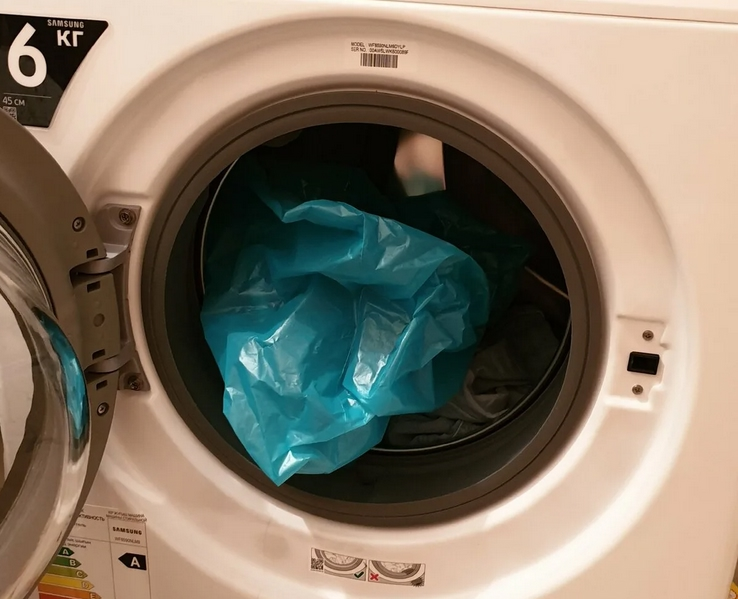 - При температуре выше 40 градусов Цельсия полиэтилен начинает деформироваться и плавиться. Расплавленный пакет может прилипнуть к барабану, нагревательному элементу или одежде, оставив трудноудаляемые следы и повредив машину. Также скомканный пакет могут повредить резиновые уплотнители люка.