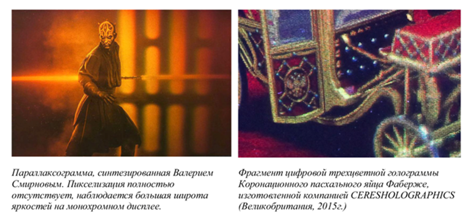 На Рис. 6 показано как воспринимается глазами человека синтезированная отражательная стереопара. Чем больше используется двумерных ракурсов для синтеза мультиплексной голограммы, тем естественнее будет восприниматься объем сцены. Оптимальное количество горизонтальных ракурсов примерно равно 200.