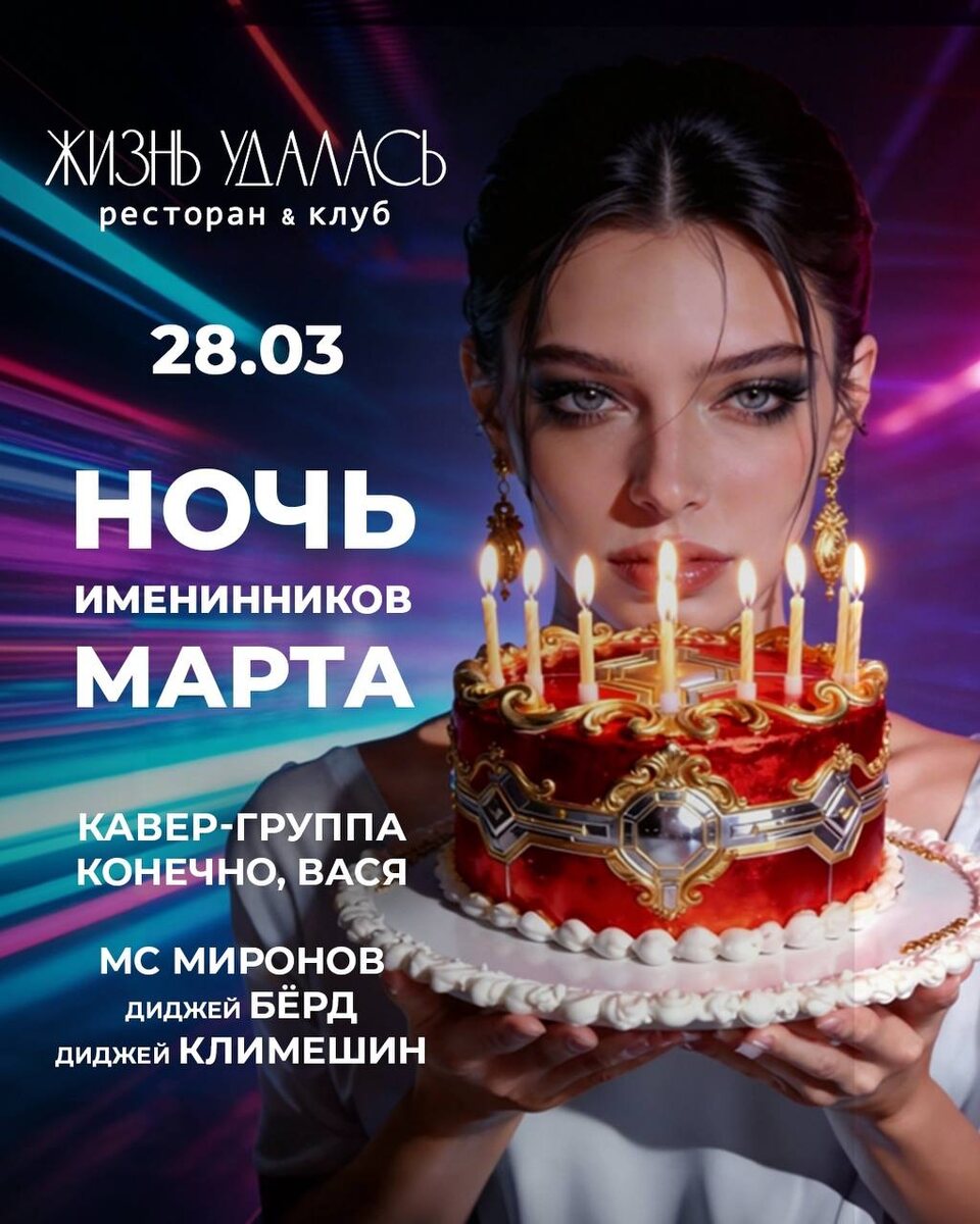 » Дата: 28 марта (суббота) Начало: 20:00 ➡️ Приглашаем отпраздновать день рождения ещё раз — специально для тех, кто отмечал его в уходящем месяце! Специальные условия для именинников марта: -скидка 15 % на чек; -бесплатный вход для именинника и одного гостя. ➡️Программа вечера: - массовое поздравление с шампанским; - выступление кавер‑группы «КОНЕЧНО, ВАСЯ»; - ведущий — Д. Миронов; - сеты от резидентов‑диджеев: Юра Бёрд иКлимешин; - шоу с подтанцовкой. Условия входа: для девушек — бесплатно; для парней — 500 рублей; 🔗Бронирование и контакты: онлайн‑бронирование столиков: zhiznudalas.ru; телефон для справок: +7 (846) 211‑55‑67. ул. Лесная, дом 23, корпус 49А. Ресторан имеет два входа — состороны набережной и с парковки КИНАПа.