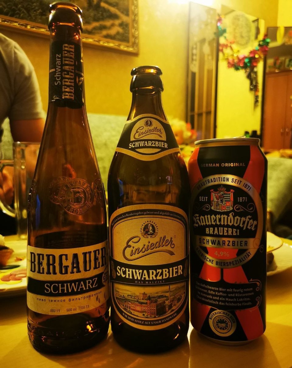 🎉Долгожданная дегустация тёмного немецкого лагера - Schwarzbier, что переводится как «Чёрное пиво». И, действительно, цвет пиваса поглощает свет как черная дыра. 🍻Сорт варится в немецких Саксонии и Тюрингии, отличается небольшим процентом алкоголя, легким вкусом и мягким ароматом. Искать этого другана по городу стало настоящим испытанием. Нашлось лишь 3 варианта, и все были закуплены в 3 разных местах (Лента, Перекресток, Beer Patrick's Club). И вот эти красавцы: 🍺Bergauer 🍺Einsiedler 🍺Kauerndorfer Начнем с первого пиваса этого сорта, который Батя попробовал уже давненько - Bergauer. По запаху напоминает мягкий стаут, первый глоток сразу же подтверждает этот факт. По вкусу водянистый стаут, который отличается лишь пустым, но цельным ровным вкусом. Послевкусие от него держится крайне недолго, и из за этого оно моментально забывается. Пиво нормальное, но с оговорками. Мыльно, пусто и не очень интересно. Вкус не запоминающийся, горечь начинает подбешивать к концу употребления. И како