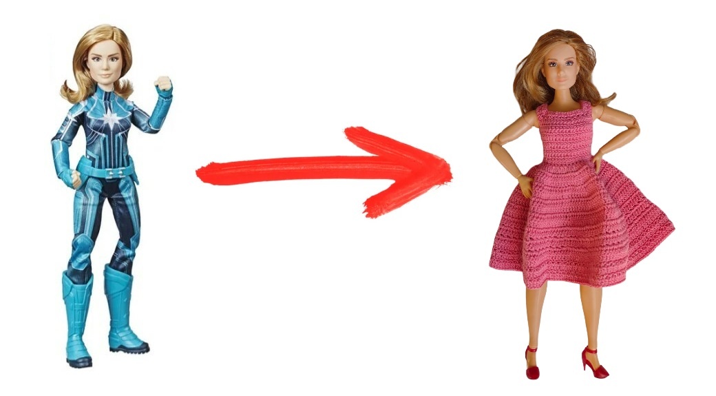 Около двух меяцев назад мне попалась кукла Капитан Марвел,CAPTAIN MARVEL (STARFORCE) SUPERHERO, вот так на промо фото выглядит кукла в полном аутфите: Кукла была нюд, но в целом, сразу было понятно, что ей нужно новое тело, потому что оригинальное тело для моих нужд совершенно не подходило. (Тем временем мои нужды: наряжать куколок в шикарных леди и искать им кавалеров, хи хи хи) Оригинальное тело имеет огромные кисти, сомкнутые в кулаки, еще и с молдированными синими перчатками, короткие бедра, при достаточно вытянутых икрах и укрупненные ступни, на которые очень сложно подобрать обувь: В интернете, в таблице скинтонов для Капитана Марвел советуют брать барби со скинтоном Nostalgic (барби йога пышка Джойс, йога Неко), но я сколько не прикладывала голову к йоге пышке Джойс всегда видела разнотон. Моя капитанша была с желтым оттенком и разнотон не давал мне покоя. Поэтому было решено брать тело со скинтоном Warm Ivory. В качестве донора у меня изначально подразумевалась Барби Экстра