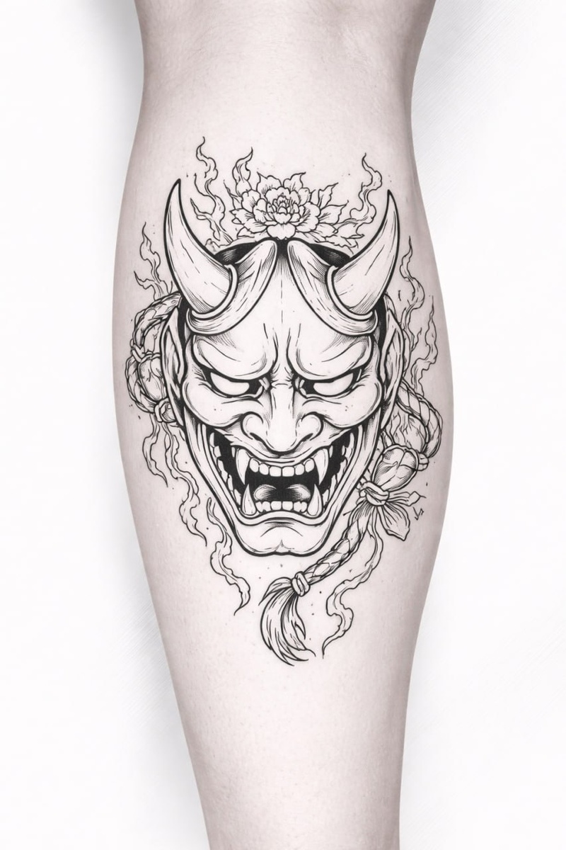 Эскиз контурной татуировки маски Ханья — символа сильных эмоций, страсти и внутренней борьбы