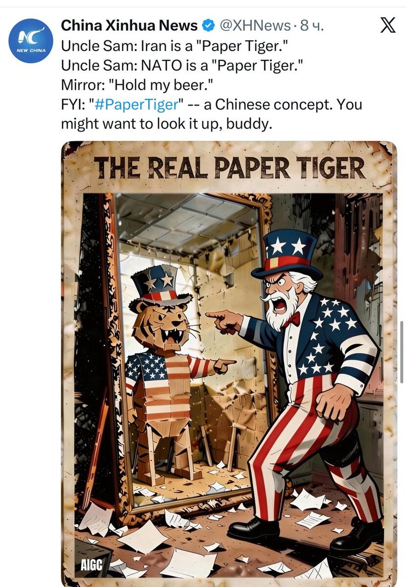 🇨🇳🇺🇸Китайское информационное агентство «Синьхуа» напрминает Трампу, что «бумажный тигр» - китайское выражение.