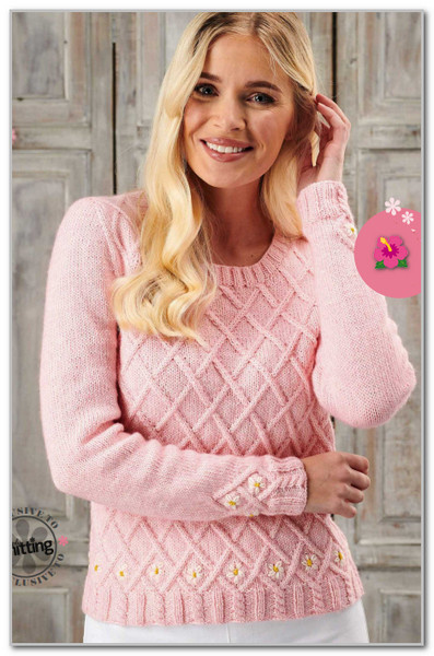 Вам потребуется: пряжа Scheepjes Stone Washed (толщина Sport, 78% хлопок, 22% акрил, 50 г/130 м) - 400 (450, 500, 550, 600, 700, 750) г нежно-розового цвета, небольшое количество пряжи кремового и желтого цвета для вышивки; спиц 3.25 мм и 3.75 мм, вспом. спица для кос, 2 держателя для петель, гобеленовая игла (с тупым кончиком).