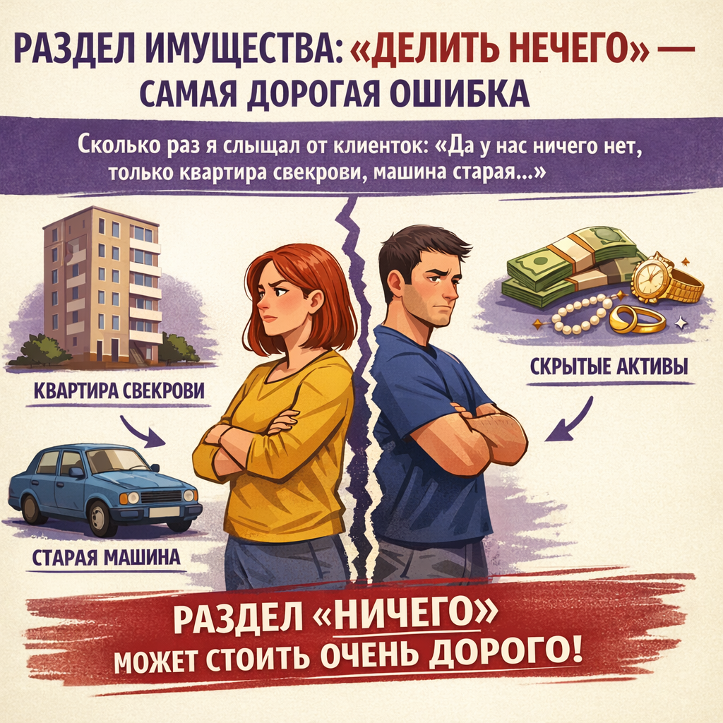 Сколько раз я слышал от клиенток: «Да у нас ничего нет, только квартира свекрови, машина старая и кредиты». Через год выясняется: у бывшего открыт бизнес на друга, куплен новый автомобиль, а на счетах — приличные суммы. И всё это — мимо вас.