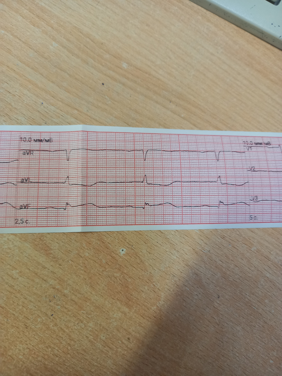 Давление, рвота. 3 этаж. Женщина бледная, влажная (уже думаешь, что-то будет). Говорит, что три дня болит грудь, сегодня боли ушли в правый бок, рвота, давление, сахар 17. На пленке красивый инфаркт. Вынесли на носилках, привезли в Итар.