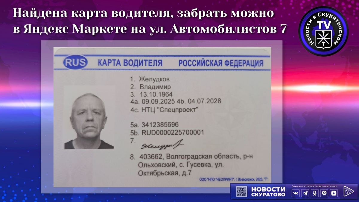 Найдена карта водителя, забрать можно в Яндекс Маркете на ул. Автомобилистов 7