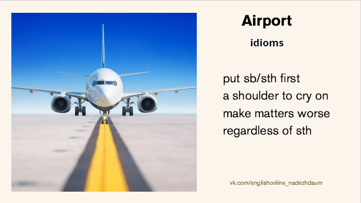 В книге много выражений, связанных с гражданской авиацией. А также, каждая книга – это возможность увидеть выражения из книг, которые вы прочитали на английском языке и из фильмов, которые вы посмотрели на английском. Чем чаще вы видите выражения, тем лучше вы их запоминаете. · put sb/sth first – ставить кого-то, что-то на первое место · a shoulder to cry on - человек, которому можно поплакаться в жилетку · make matters worse – в довершение всех несчастий · regardless of sth - независимо от чего-либо · a take-off – взлет (самолета) · a landing – посадка (самолета) · to delay a take-off – задерживать, откладывать взлет · the flights are delayed – рейсы задержаны · an airfield – аэродром · a runway - взлетно-посадочная полоса Книга рассказывает о том. как работает международный аэропорт, какие есть отделы и как они работают, с какими проблемами сталкиваются сотрудники аэропорта. Мы наблюдаем за героями книги, когда они работают, а также за их жизнью вне работы. Книга будет полезна тем,