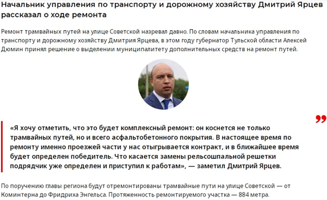 В августе 2021 г. начальник управления по транспорту и дорожному хозяйству администрации г.Тулы Дмитрий Ярцев рассказал, что губернатор Дюмин А.Г. выделил из регионального бюджета муниципалитету дополнительные денежные средства на ремонт трамвайных путей на ул. Советская в г.Туле в размере 168 млн. руб. Исполнителем определена компания-подрядчик «Техноконцепт», представитель которой Тагир Вагитов заверил туляков, что используется стандартная технология, применяемая во многих городах России, а Дмитрий Ярцев пообещал, что реконструкция трамвайных путей на ул. Советской улучшит работу трамвайных маршрутов, увеличит среднюю скорость движения трамваев на 25-30 %, положительно скажется на транспортной доступности и снизит вероятность ДТП.