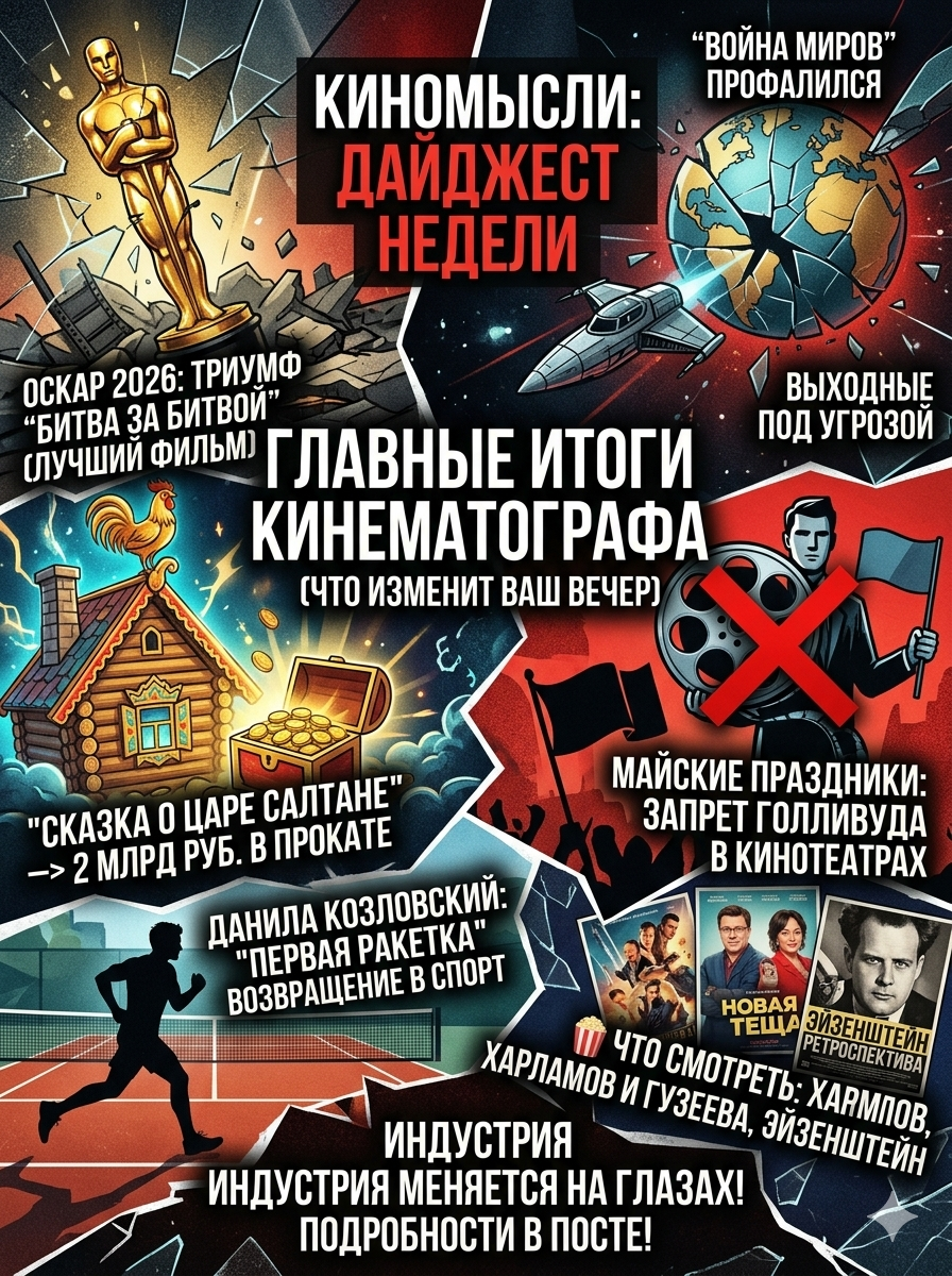 Неделя в индустрии выдалась аномально насыщенной: от триумфального «Оскара» до радикальных запретов в прокате. Пока Голливуд празднует, отечественный рынок переписывает правила игры. Главным событием недели стал «Оскар», где историческая драма «Битва за битвой» буквально уничтожила конкурентов, забрав статуэтки за лучший фильм и режиссуру. В то же время амбициозный блокбастер «Война миров» официально признан худшим фильмом года — редкий случай, когда критики и зрители были единодушны в своем разочаровании. В кинотеатрах стартовала комедия «Новая теща» с Гариком Харламовым и Ларисой Гузеевой (взрывной дуэт!), а для любителей классики в «Художественном» проходит полная ретроспектива Сергея Эйзенштейна. Индустрия лихорадочно меняется. А на какой стороне вы: ждете возвращения Голливуда или наслаждаетесь эпохой «сказочных» блокбастеров? Источник: Кино-Театр.Ру, Кинопоиск, Мир Фантастики. #КиноМысли
