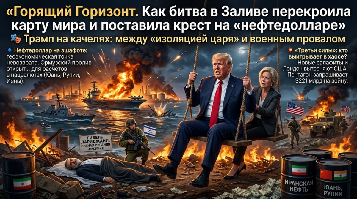 🚨 Колонка МюнхгауZена: Горящий Горизонт. Как война в Заливе перекроила карту мира и поставила крест на «нефтедолларе» В этом жесте — вся нервозность тех, кто привык править, но вдруг почувствовал, как почва уходит из-под ног: десятилетиями Израиль диктовал Вашингтону повестку на Ближнем Востоке, но сейчас, когда Трамп начал действовать в собственных (и нефтедолларовых) интересах, союзник запаниковал и пошёл на отчаянную, деструктивную меру, лишь бы не дать «большому брату» выйти из игры. 🔹 Нефтедоллар на эшафоте: геоэкономическая точка невозврата Пока в воздухе свистят ракеты, в подземельях финансовых столиц мира происходит нечто более значимое. Администрация Трампа, ещё недавно грозившая Ирану голодной смертью через санкции, вдруг заговорила о... разблокировке долларовых платежей за иранскую нефть. Сценарий, немыслимый ещё в феврале, ныне стал реальностью. Почему? Потому что кризис «производства нефтедолларов», тот самый, о котором аналитики предрекали как о далёкой перспективе,